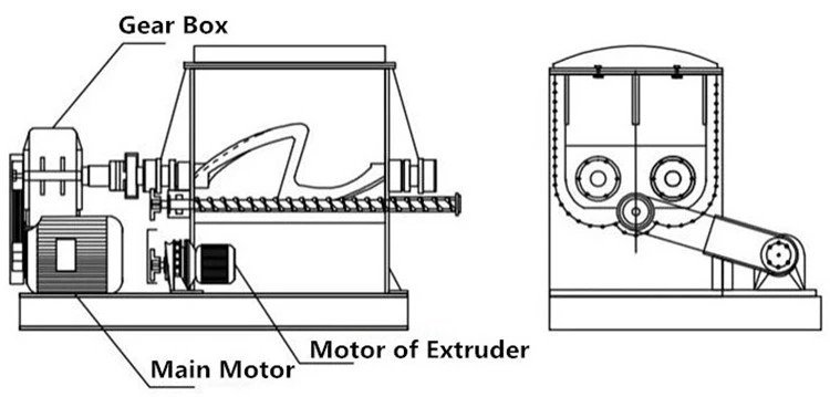 This type of mixer combines the action of the Double Arm Sigma Blade Mixer with an extrusion screw placed in the lower part of the mix trough.